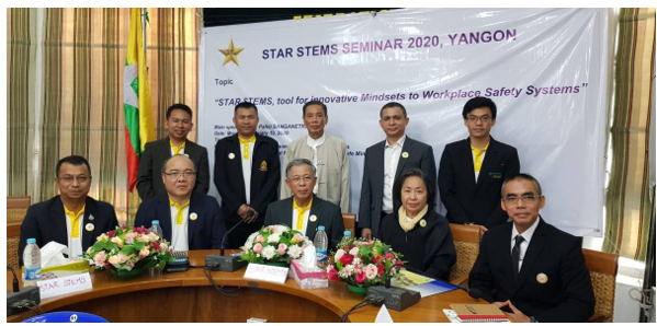 STAR STEMS ยังได้ไปเผยแพร่แนวคิดในต่างประเทศ เมื่อวันที่ ๑๐ กุมภาพันธ์ ๒๕๖๓, องค์กร Safe Mind (Myanmar) Project ,SMMP : ของประเทศเมียนมาร์ ได้ร่วมกับ Federation of Myanmar Engineering Societies จัดการสัมมนาในหัวข้อ “ STAR STEMS, tool for innovative Mindset to Workplace Safety System” ที่เมืองย่างกุ้ง ประเทศเมียนมาร์ มีผู้เข้าร่วมกว่า ๑๒๐ คน ประกอบด้วยผู้บริหารระดับสูง ฝ่ายบริหาร วิศวกร และฝ่ายพัฒนาบุคลากร ของสถานประกอบการต่าง ๆ ผู้ร่วมสัมมนาทุกคนประทับใจและเชื่อมั่นว่า กระบวนการคิด STAR STEMS เป็นกระบวนการคิดที่มีประสิทธิภาพอย่างยิ่งในการพัฒนาคนและพัฒนางานไปพร้อมกัน และเตรียมที่จะขยายกิจกรรมสัมมนา STAR STEMS ต่อไป